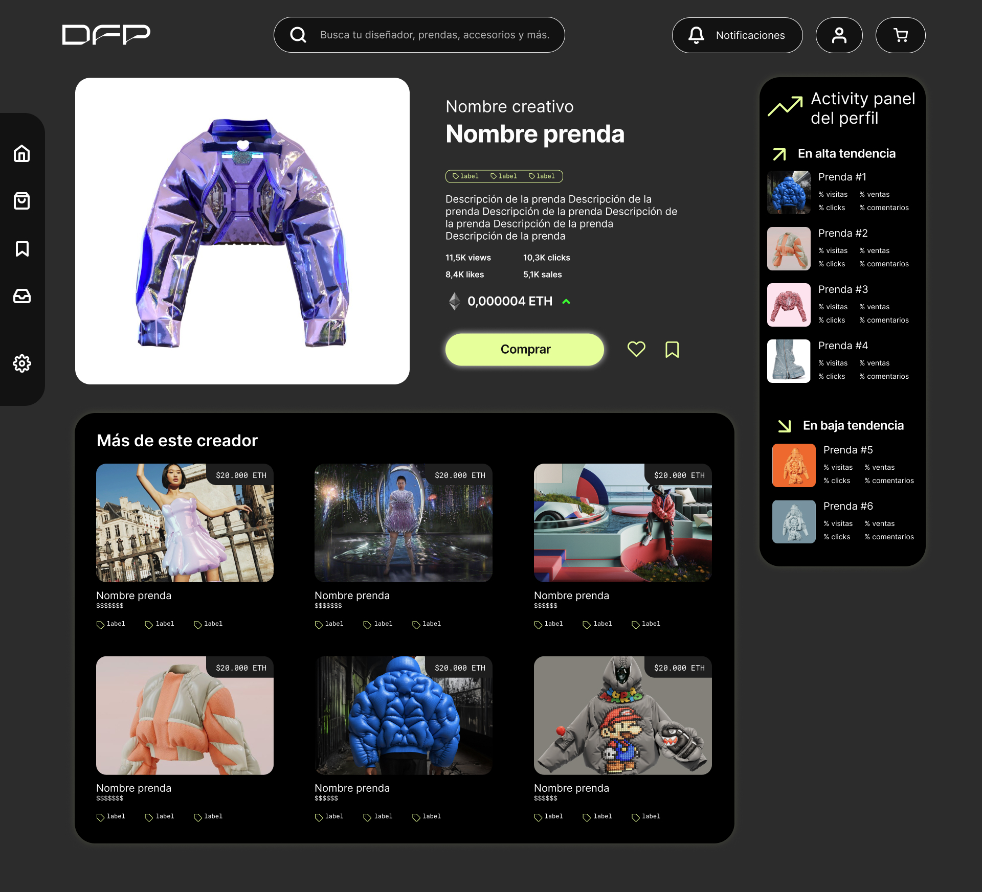 Plataforma web para la venta y exhibición de activos digitales de moda de artistas chilenos emergentes.