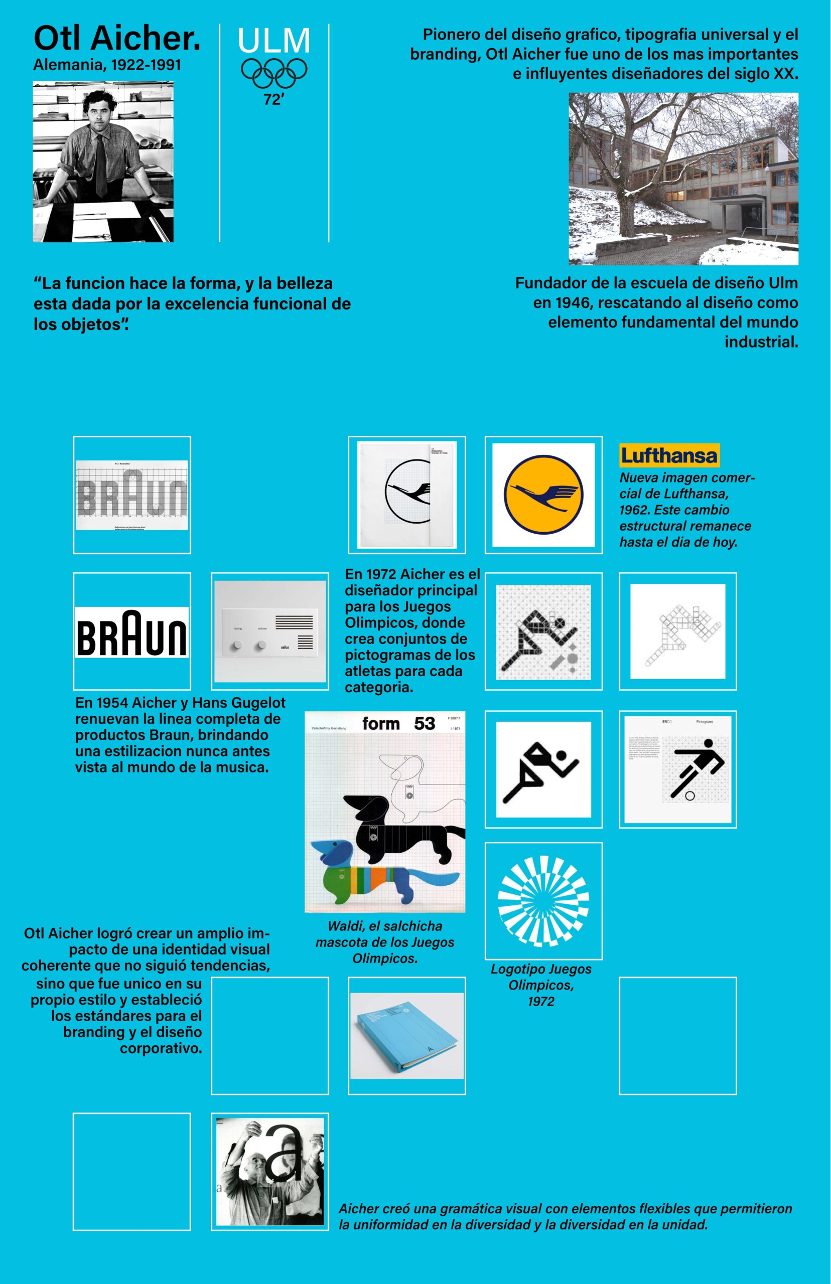 Infografía – Otl Aicher Infografía del diseñador gráfico Otl Aicher, responsable de la definición de los iconos olímpicos y la comunicación translingual. Servicio Research Académico, Branding Infográfico Empresa Universidad del Desarrollo Herramientas Illustrator, Photoshop