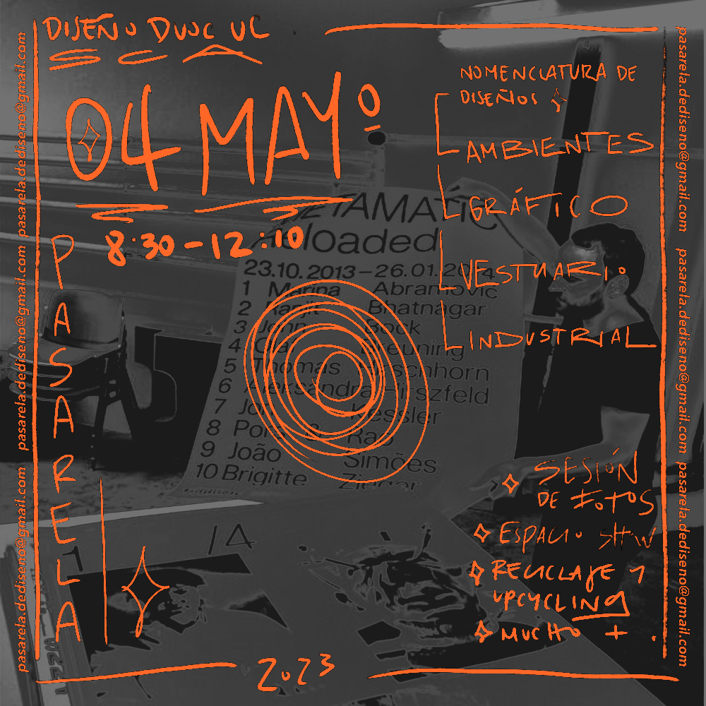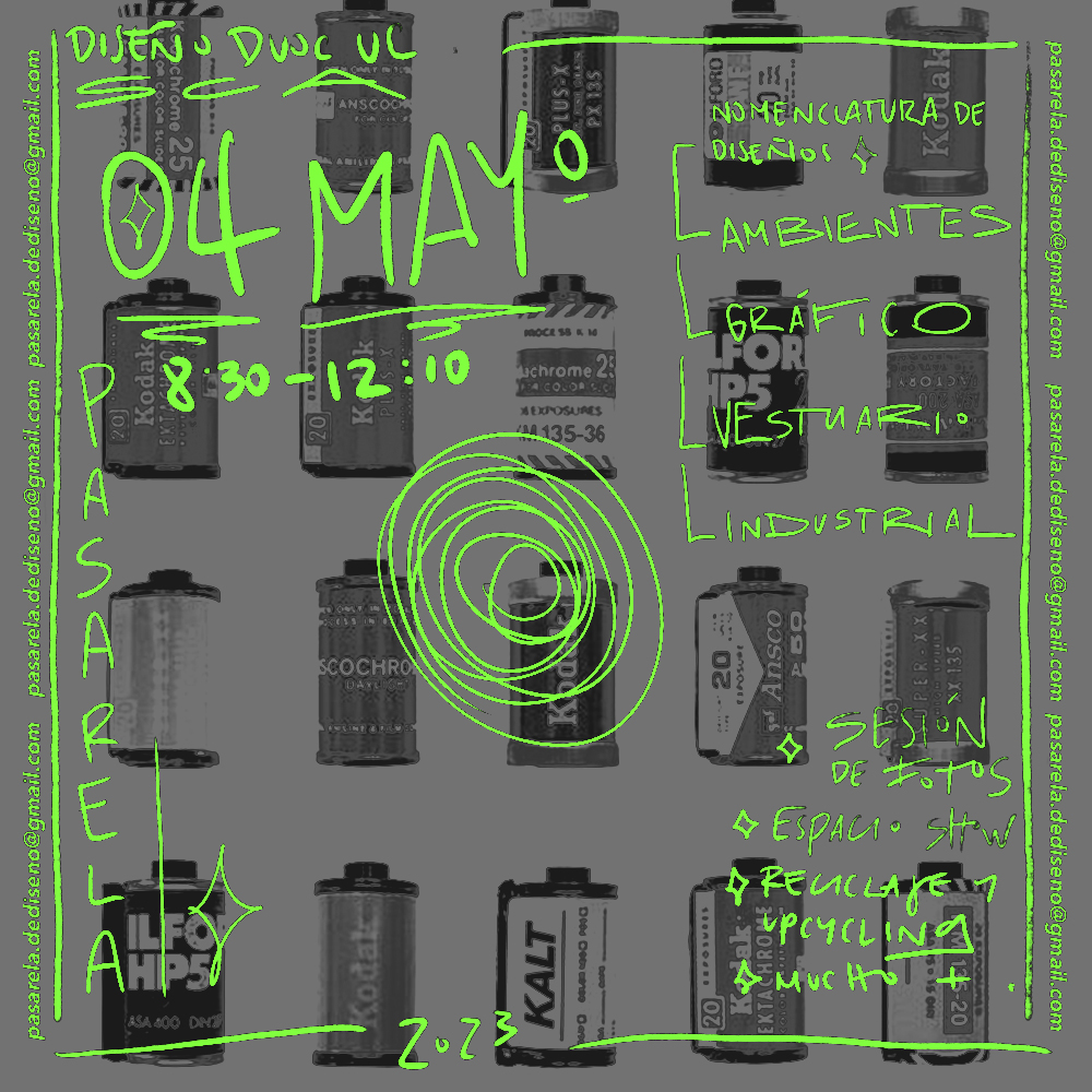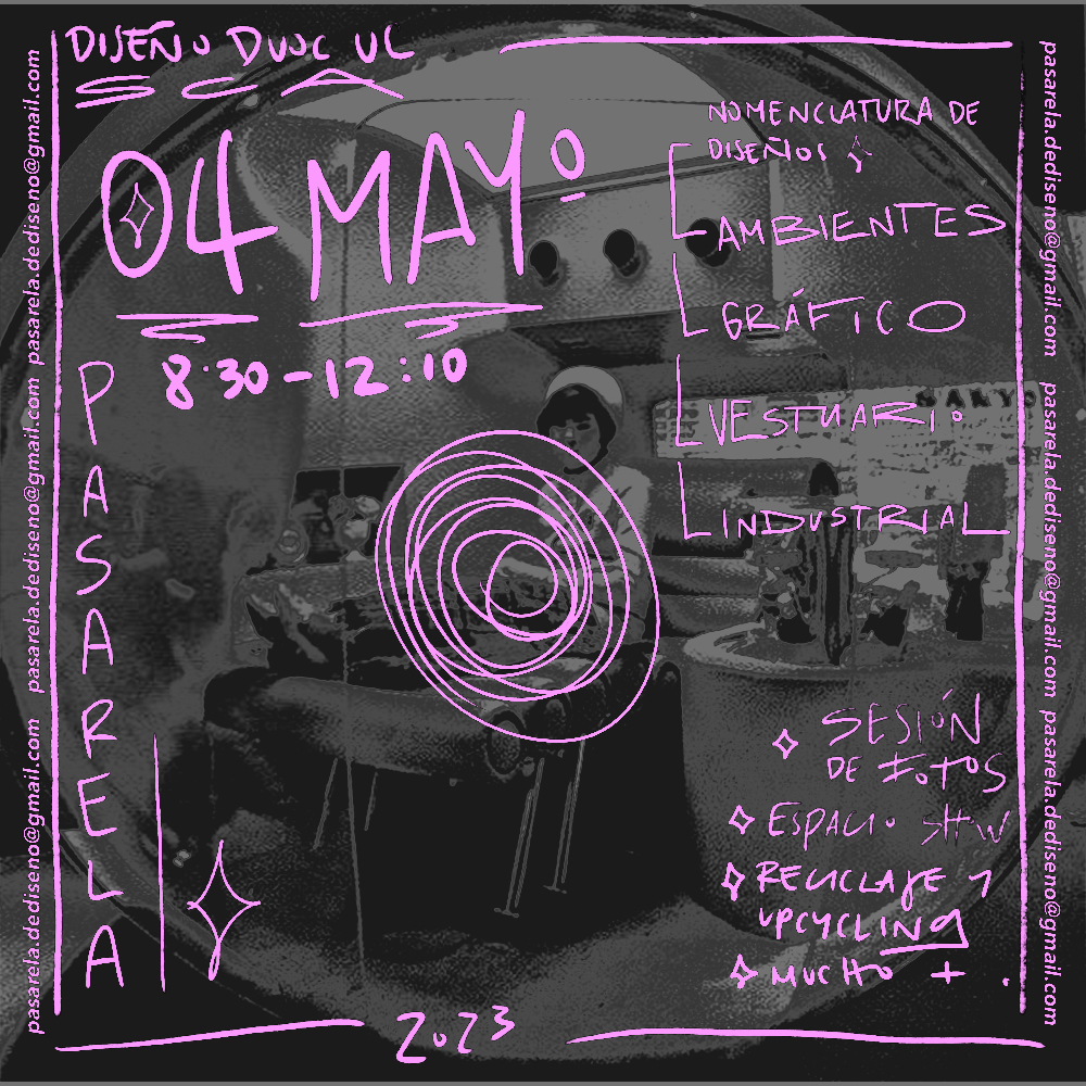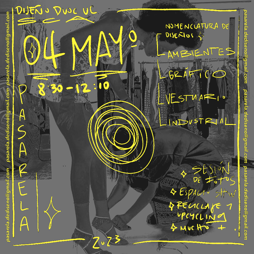 Diseño de flyers de 5×5 cm para repartir a estudiantes del instituto DUOC UC, enfocado en invitar a participar de una Pasarela de Diseño de la Escuela de Diseño de San Carlos de Apoquindo, que buscaba crear un espacio de exposición y muestra de trabajos realizados por las cuatro áreas de especialización: ambientes, gráfico, vestuario, e industrial.